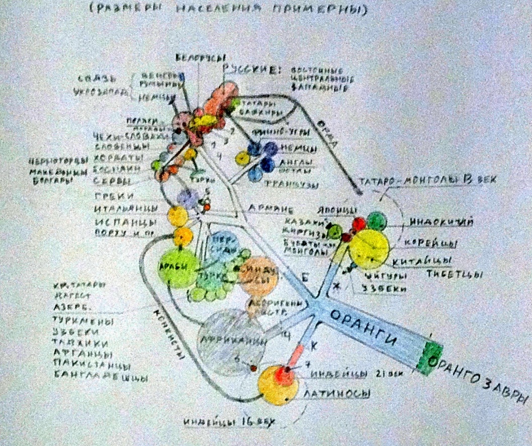 Благоприятный климат на Земле, низкая гравитация и давление, начали синтез живого из воды и минералов. Появились микробы, растения, стал скапливаться кислород (вся атмосфера составила 3-5 км.), пресная вода в низинах. Дальше перенаселённость, содружество и любовь родили гигантов, добродушных таких, которые кушали травку высотой в 10-15 метров. Но вот некоторые что-то захотели мяска. В начале, как некоторые плотоядные цветочки сейчас (да и человек с хитростью дружелюбия), любя лизали, тихо прикусывали и впивались зубами. Ну а дальше вкус и запах крови делал свое дело в мозгу. Но до этого было уже много животных, в том числе и гигантские ящеро-обезьяны (Орангозавры), которые через 5-8 поколения обрели черты гигантских обезьян. Эти обезьянки были высотой 4-6 метров и имели тёмно-оранжевый или медный цвет волос и кожи (типа орангутангов), с раскосыми глазами (передалось от ящеров). Ну, назвал я их Орангами. Продолжительность жизни динозавров при тогдашней гравитации была 200-250 лет. Обосновались они у пресного моря в центре континента (скорей всего нынешняя Саудовская Аравия), по экватору. Но там же обосновались и шустрые мясоеды. Стадо обезьян хоть и стала многочисленным, 2-3 тыс., но сильно страдало от них. Пришлось мыслить, как защититься, в руках появились палки, камни. Пожив так пару тысячелетий, сообразили, что надо мигрировать вверх по склонам, тем более всё больше подъедали корм. Началось великое расселение, как раз и атмосфера наполнялась, не все динозавры могли дышать разряжённым воздухом на высоте 300-500 метров. Одна часть оранжевых пошла на юг, другая на север, третья и четвёртая разошлись на запад и восток. Уже через поколение по мере расселения и внешних факторов (еда, климат) начались мутации. У ушедших на юг в более тёплую зону цвет кожи стал темнее, у северян естественно светлее в более прохладном климате. У этих двух групп так же менялись черты лица, особенно разрез глаз, где вдали от экватора надзор Луны был слабее и глаза не старались вылезти из орбит, что не надо было напрягать веки. Восточные приобрели жёлтый цвет, а западные красный (опять же-ж еда и рельеф местности). Тем временем Луна отодвигалась от Земли по спирали, мм. за мм., гравитация Земли менялась. Природа на Земле хотела тоже быть и чувствуя изменения начала дублировать своих детей. Всё больше начали появляться мелкие животные (саблезубые и пр.) которые быстро плодились, но жили 50-100 лет. В те времена природа была счастлива. Она плодилась из-за самого благоприятного климата, который когда-либо был на Земле, особенно в области тогдашнего экватора (наверно поэтому здесь много нефти). Обезьяны, набиравшиеся ума, так же начали рождать маленьких 2-3 метра, живших 100-120 лет, но и быстрее плодившихся. Некоторые оставались с родичами и обучались, другие же уходили и оставались несведущими, но вполне могущими прокормиться. Они то и начали новые ветви горилл, обезьян (в основном у южных и северных). Причём это было у всех 4 рас независимо (всё похоже друг на друга и имеет память корней).