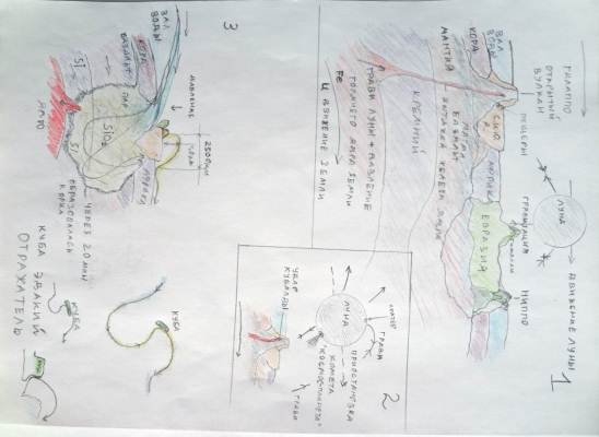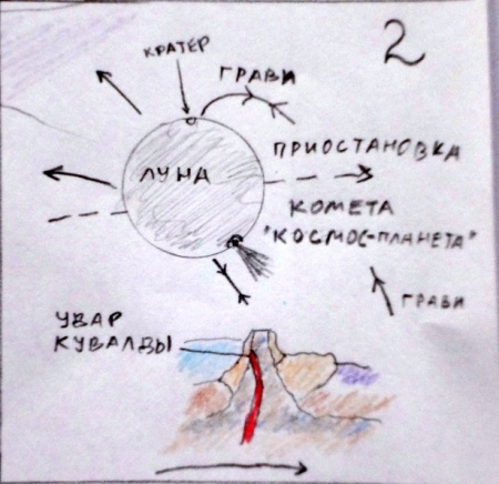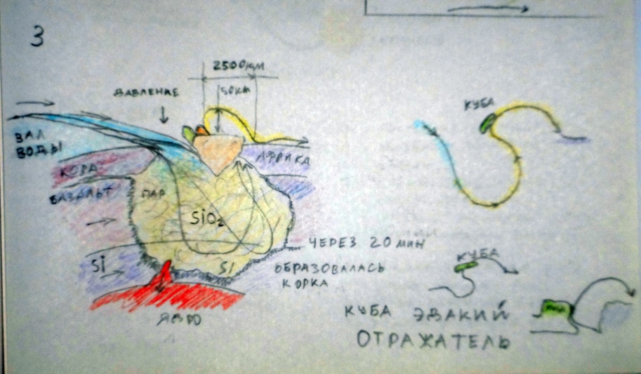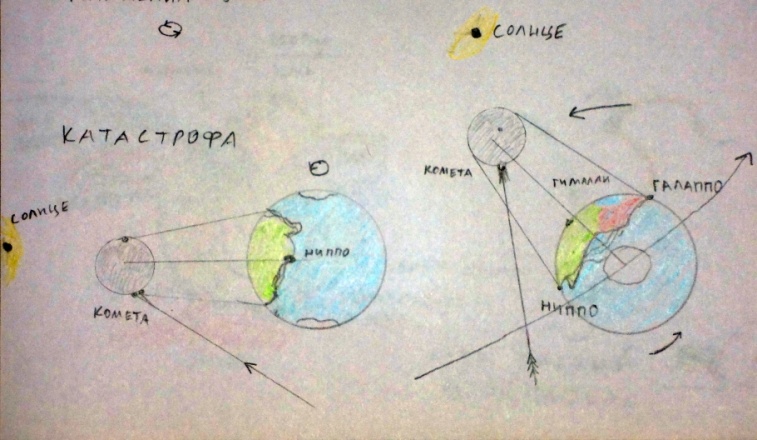 В один хороший день, по направлению к Ярилу летела ярая комета, путь которой пролегал точно через Землю. Луна, призванная защищать племянницу от такой быдлятины, приняла удар на себе. Удар кометы «космос-планета» был болезненный, тётку отбросило на пару сотен км., но племянница успела её удержать. До сих пор Луна не может отойти от удара, страдая паркенсоном. Ну а что же наша Земля? Испугавшись за свою родственницу, всё тело её всколыхнулось. Вначале внутренности, а затем лицо стало выглядеть старше и желание танцевать остановилось. Как произошла катастрофа? Кометный удар, отброс Луны. Резкий скачёк энергии грави от приостановившейся Луны мощным ударом жидкого металлического столба пробивает кору подмытую магмой за тысячелетия (а может просто магма начала падать, в следствии выгорания вещества нейтроника) именно в месте тихого вулкана Галаппо, Галапогосского выступа, обрушивается вниз к ядру освободившись от гравитации Луны. ВодЫ по экватору, которые постоянно были приподняты гравитацией Луны, с превеликим удовольствием начали засасываться в бездну, оставляя след. Ну, а дальше физика, математика: капля воды прикоснувшись с раскалённым маслом… ля-ля-ля или бла-бла-бла, ну для совсем забывших: масса воды увлекаемая и разгоняющаяся… короче есть инет. Давление пара вскипячивается, со «скоростью света» несётся туда где тонко. А именно к «удачно» разработанному карьеру Атлантами, разрывая кору отталкивает часть суши, теперь остров свободы Куба и п-ов Юкатан, в пресное море Мехикано и через разлом бьет в сторону Африки на 2500км. и высоту 50 км., увлекая за собой вначале дроблённый чёрный вулканический песок, затем красный песок измолотой горной породы и наконец, соединённую с кислородом воды кремниевую оболочку железо-уранового ядра в виде жёлтого и белого песка, чистейшего кварца.