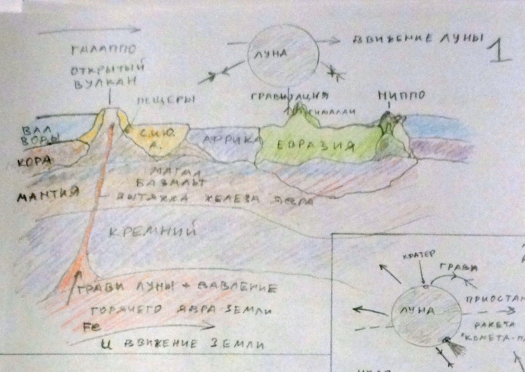 После формирования и остывания коры мантия под ней растекалась равномерно и центр просел, образовав не глубокую котловину с возвышенностями, морщинками–горами на сгибах при распрямлении, повышаясь к краям, которые стали горами (чаша Бога). Так сформировалось лицо Земли – Пангея. С двух краёв Пангеи, при формировании пыл страсти и надзор Луны образовали две горы с вулканами по экватору, Ниппо и Галаппо. Через пару тысячелетий восточный погас и затянулся, а западный был горяч и открыт. Луна, своей гравитацией вытягивала столб жидкого сплава из сердца Земли. При уже сформированной корке в некоторых местах при сварке выделились капельки в мировой океан, которые прокатились и застыли островами, о. Пасхи потерявший по пути массу и многие другие. А капелька Гавайев, которая быстро прокатилась притягиваемая Луной, прожгла в нежной корке дыру, образовав вулканы. Так же при остывании образовались (кора растрескалась): Средиземноморская, Черноморская, Каспийская, Балтийская, Европейская, Персидская и Атлантская низменности с озёрами, а так же жёлтого, южно-китайского и охотского морей, низменности ледовитого океана, Берингово море.