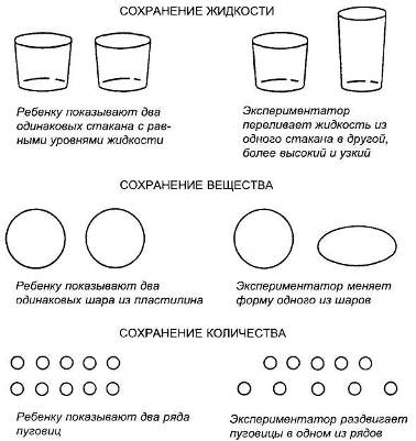 Рис. 13. Три типа задач на сохранение для исследования мышления ребенка на стадии конкретных операций