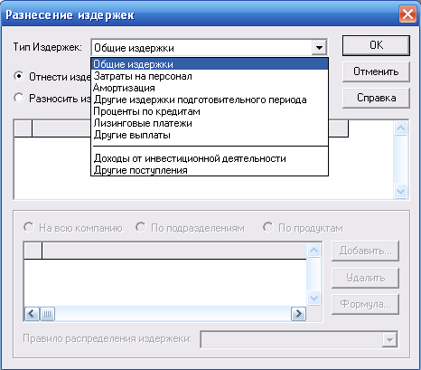 Рисунок 13 - Меню «Разнесение издержек»