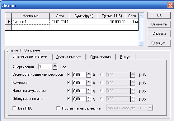 Справка: Условия проведения каждой операции определяются в нижней части диалога в карточках: - лизинговые платежи;