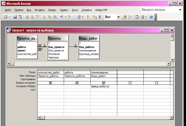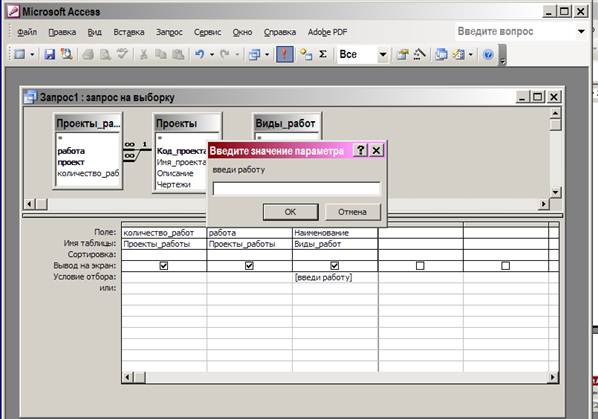 В нижней половине – бланк запроса, там формулируются условия отбора. Если в строке условия - текст в квадратных скобках – это запрос с параметром, параметр принимает значения условия отбора при вводе значения параметра.
