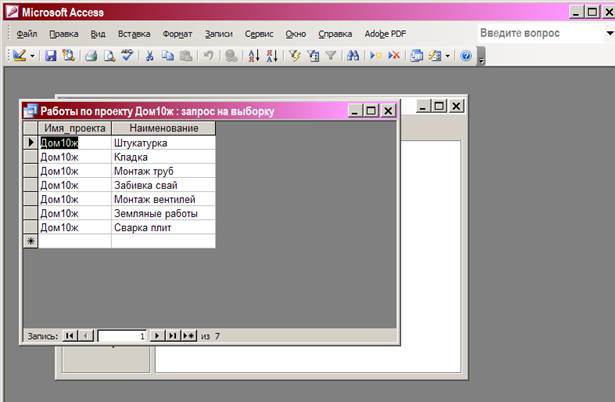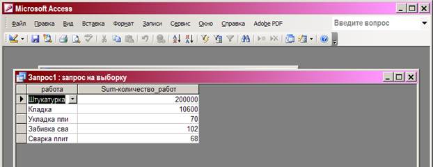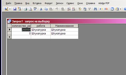 В качестве параметра в окне введен вид работ Штукатурка. Далее не сохраняя запрос, исполним его кнопкой!