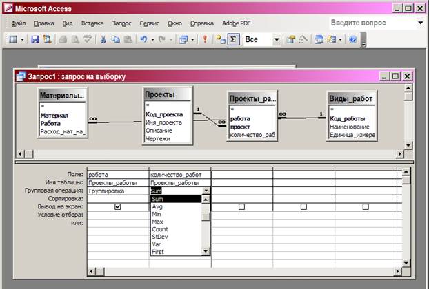 В этом запросе требуется показать суммарное количество работ каждого вида, предусмотренное в проектах. Это итоговый запрос (запрос с групповыми операциями) Группировка – перестановка записей по группам с одинаковыми значениями в поле группировки. Здесь это поле работы. Агрегирующая функция Sum суммирует все значения в поле, где она назначена, в пределах группы.