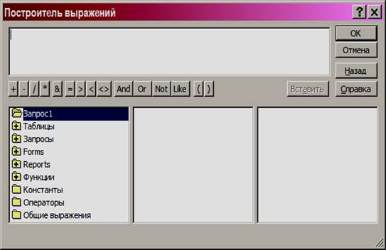 Формула строится с помощью этого окна, где операторы формул и другие элементы формируются, выбирая в этом окне. Имя нового поля Выражение1, переименовать можно в бланке запроса, куда попадает выражение после закрытия окна Построителя. Результат исполнения запроса показан ниже.