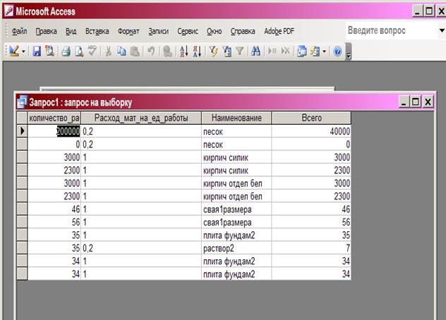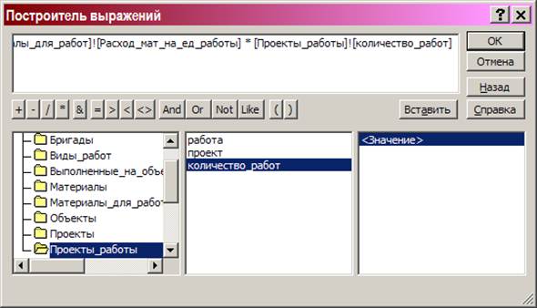 Требуется выполнить расчеты: сколько материалов каждого вида требуется для каждого проекта. Вычисляемое поле будет создано, курсор размещается в первый пустой столбец справа в бланке запроса. Затем вызывается Построитель (кнопка), который формирует формулы в столбце.