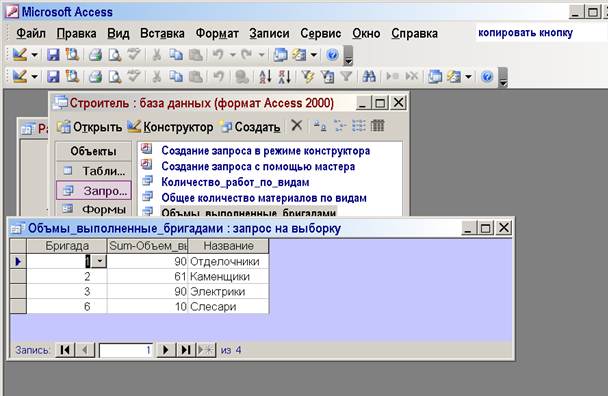 Суммарные объемы бригад. Показан запрос в Конструкторе и его результат