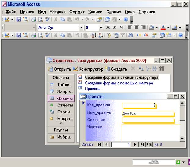 Форма ввода Проекты создана Мастером форм, на вкладке Формы, через создание.