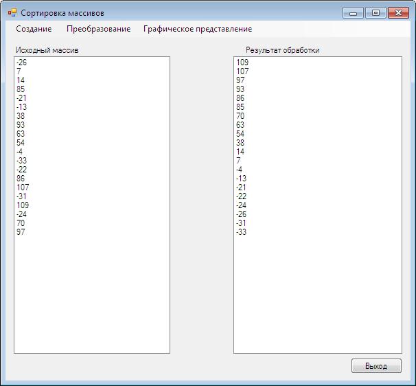 Пример программы, которая формирует одномерный массив из 20 случайных чисел больших (-40) и меньших (110) и, по выбору пользователя, сортирует его по невозрастанию или отфильтровывает положительные элементы. Программа, по заданию пользователя, создает двумерный массив – матрицу