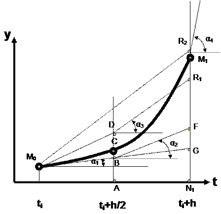 следующая. Пусть кривая М0СМ1 (рис.1) есть решение дифференциального уравнения (1). Точка С этой кривой лежит на прямой, параллельной оси y и делящей отрезок