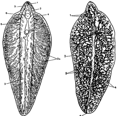 Рассмотрите через увеличительное стекло тотальные препараты печеночного сосальщика, кошачьего сосальщика. Подпишите рисунки и сделайте обозначения: ротовая и брюшная присоски, двухветвистый кишечник, матка, выделительную систему