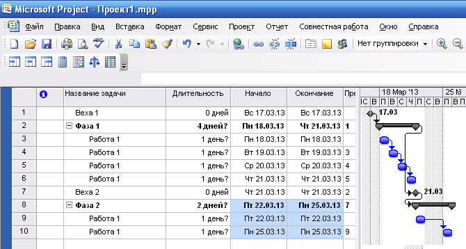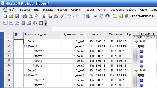 Следующим шагом в разработке плана является ввод данных о длительности задач. Длительность задач определяется значением, введенным в колонке Duration (Длительность). Длительность фаз вводить нельзя - она рассчитывается автоматически.
