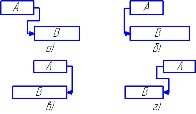 Связь типа окончание–начало (рисунок 2, а) – это наиболее распространенный случай связи между работами. При такой связи работа В не может начаться раньше, чем закончится работа А. Связь типа начало–начало (рисунок 2, б) означает, что работа В не может начаться, пока не начнется работа А. При помощи такой связи обычно объединяются задачи, которые могут выполняться параллельно. Связь окончание–окончание (рисунок 2, в) обозначает зависимость, при которой задача В не может закончиться до тех пор, пока не закончится задача А. Обычно такой связью объединяются работы, которые выполняются одновременно, но при этом одна не может закончиться раньше другой. Связь типа начало–окончание (рисунок 2, г) обозначает зависимость, при которой работа В не может закончиться, пока не началась работа А.