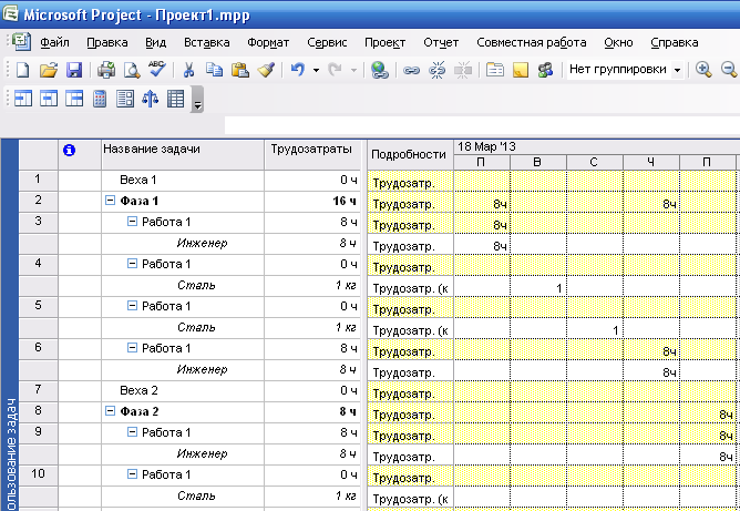 После того как назначения созданы, программа определяет материальные затраты и трудозатраты каждого из ресурсов для выполнения задачи и планирует распределение этих затрат в каждый из дней на протяжении всей ее длительности. Подробное распределение затрат по дням отражается в представлении на рисунке 6.