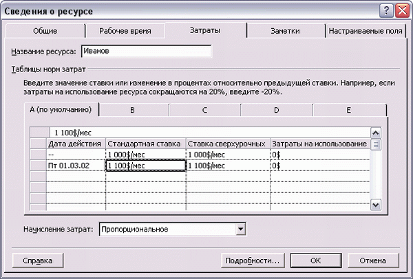 Стоимость использования ресурса определяется на вкладке Costs (Затраты) в диалоговом окне сведений о ресурсе. На этой вкладке в разделе Cost rate table (Таблицы норм затрат) расположены пять таблиц норм затрат с одинаковой структурой, переключаться между которыми можно с помощью вкладок А, В, С, D и Е (рисунок 7).