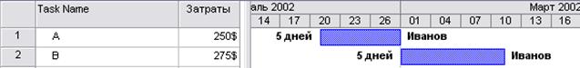 Например, на рисунке 8 введена ставка использования ресурса Иванов, равную 1000$/то (1000$/мес) с начала проекта и 1100$/то (1100$/мес) с 01.03.2002. Это значит, что при расчете стоимости назначения Иванова начиная с 01.03.2002, программа будет использовать новые ставки. Результат этой настройки виден на рисунке 8. Задача В с теми же трудозатратами (5 дней), что и А, стоит дороже потому, что начинается после 1 марта 2002 года и расчет стоимости ресурса происходит по новым ставкам.
