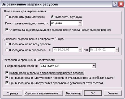Автоматическое выравнивание ресурсов производится через диалоговое окно «выравнивания загрузки ресурсов», которое открывается с помощью команды меню Tools > Level Resources (Сервис > Выравнивание загрузки ресурсов). В разделе Leveling calculations (Вычисления для выравнивания) определяются общие параметры выравнивания загрузки (рисунок 9). Переключатели Automatic (Выполнять автоматически) и Manual (Выполнять вручную) определяют, как будет осуществляться выравнивание: непосредственно при создании назначений (первый вариант) или при нажатии кнопки Level Now (Выровнять) в этом диалоговом окне (второй).