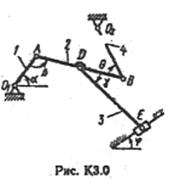 Указания. Задача К3 - на исследование плоскопараллельного движения твёрдого теля. При её решении для определения скоростей точек механизма и угловых скоростей его звеньев следует воспользоваться теоремой о проекциях скоростей двух точек теля и понятием о мгновенном центре скоростей, применяя эту теорему (или это понятие) к каждому звену механизма в отдельности.