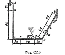 Определить реакции связей в точках A, B, C (для рис. 0, 3, 7, 8 ещё и в точке D) вызванные заданными нагрузками. При окончательных расчётах принять а =0,2м. Направление распределённой нагрузки на различных по расположению участках указано по табл. С2а.