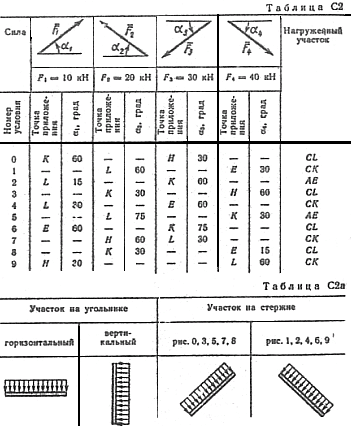 На каждую конструкцию действуют: пара сил с моментом M =60 кН·м, равномерно распределённая нагрузка интенсивности q =20 кН/м и ещё две силы. Эти силы, их направления и точки приложения указаны в таблице С2; там же в столбце "Нагруженный участок" указано, на каком участке действует распределённая нагрузка (например, в условиях №1 на конструкцию действуют сила