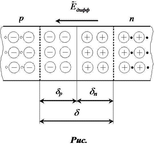 Создаются области неподвижных объёмных зарядов dр и dn, и возникает контактное (диффузионное) электрическое поле, вектор напряжённости которого