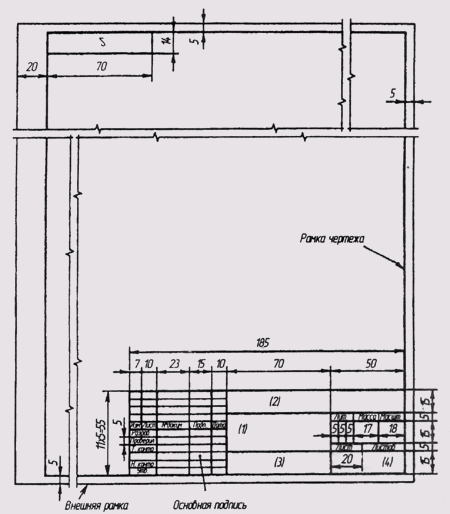 Все чертежи должны выполняться на листах бумаги стандартного формата. Форматы листов бумаги определяются размерами внешней рамки чертежа (рис. 3). Она проводится сплошной тонкой линией. Линия рамки чертежа проводится сплошной толстой основной линией на расстоянии 5 мм от внешней рамки. Слева для подшивки оставляют поле шириной 20 мм. Обозначение и размеры сторон форматов установлены ГОСТ 2.304—68. Данные об основных форматах приведены в табл. 1.