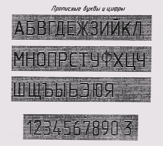 Стандартом установлены следующие два типа шрифта в зависимости от толщины d линий шрифта: тип A (d = 1 /14h) без наклона и с наклоном около 75° к горизонтальной строке; тип Б (d= 1/10h) без наклона и с наклоном под 75°. На рис. 6 приведена форма букв русского алфавита и арабских цифр, выполненных шрифтом Б без наклона.
