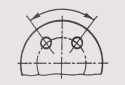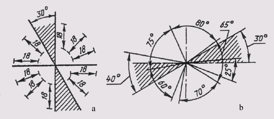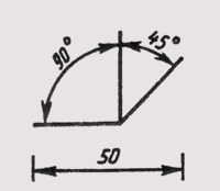Угловые размеры на чертежах проставляются в градусах, минутах и секундах с указанием единиц измерения. Размер угла наносят над размерной линией, которая проводится в виде дуги с центром в его вершине. Выносные линии в этом случае проводятся радиально (рис. 13).