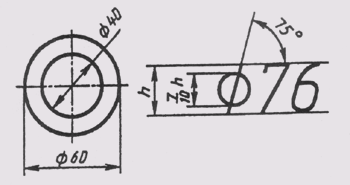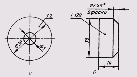 угол наклона образующей конуса равен 45°, применяют упрощенное обозначение фаски, когда размерная линия проводится параллельно оси конуса, а надпись выполняется по типу «2 х 45» (рис. 29, в).