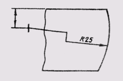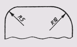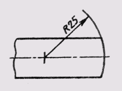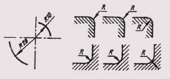 Перед размерным числом радиуса дуги всегда ставится знак в виде прописной латинской буквы R. Размерную линию в этом случае проводят по направлению к центру дуги и ограничивают только одной стрелкой, упирающейся в дугу или ее продолжение (рис. 19). Если величина радиуса на чертеже менее 6 мм, стрелку рекомендуется распо-