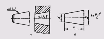 Знак конусности поверхности наносится на полке линии-выноски, расположенной параллельно оси конуса или на оси конуса (рис. 25, а). Знак конусности располагают так, чтобы его острый угол был направлен в сторону вершины конуса. Величину конусности определяют отношением разности диаметров двух поперечных сечений конуса к расстоянию между этими сечениями, т. е. k = D — dll, где D — диаметр большого сечения; d — диаметр меньшего сечения; l — расстояние между сечениями. Конусность указывают в виде простого дробного числа (рис. 25, б).