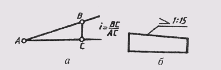 Знак уклона прямой указывают на полке линии-выноски. Уклон i представляет собой тангенс угла между данной прямой и горизонтальной или вертикальной прямой (рис. 26, а). Знак уклона располагается
