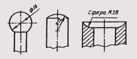 Для обозначения сферы на чертеже применяют знак диаметра или радиуса. В тех случаях, когда по чертежу сферу трудно отличить от других поверхностей, перед знаком радиуса или диаметра допускается добавлять слово «Сфера». Надпись на чертеже выполняется по типу «Сфера диаметр 17» или «Сфера R 10» (рис. 27).