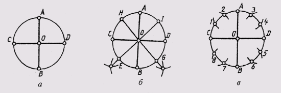 Чтобы разделить окружность на восемь равных частей, дуги, равные четвертой части окружности, делят пополам. Для этого из двух точек, ограничивающих четверть дуги, как из центров радиусов окружности выполняют засечки за ее пределами. Полученные точки соединяют с центром окружностей и на пересечении их с линией окружности получают точки, делящие четвертные участки пополам, т. е. получают восемь равных участков окружности (рис. 31, б).