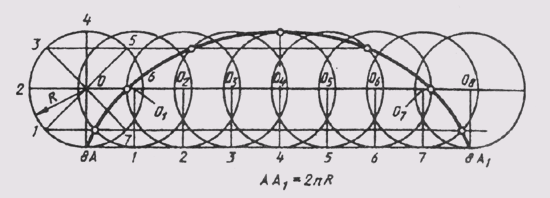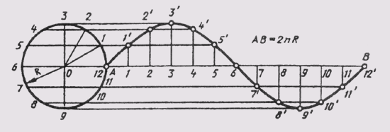 Синусоидой называют плоскую кривую, изображающую изменение синуса в зависимости от изменения его угла. Для построения синусоиды (рис. 40) нужно разделить окружность на равные части и на такое же количество равных частей разделить отрезок прямой АВ = 2лR. Из одноименных точек деления провести взаимно перпендикулярные линии, в пересечении которых получают точки, принадлежащие синусоиде.