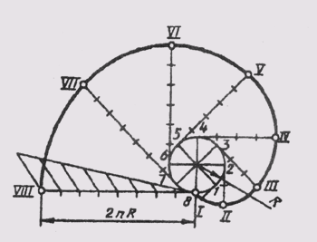 Циклоидой называют кривую линию, представляющую собой траекторию точки А при перекатывании окружности (рис. 39). Для построения циклоиды от исходного положения точки А откладывают отрезок АА], отмечают промежуточное положение точки А. Так, в пересечении прямой, проходящей через точку 1, с окружностью, описанной из центра О1, получают первую точку циклоиды. Соединяя плавной прямой построенные точки, получают циклоиду.