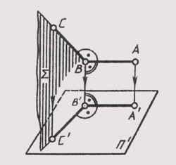 Пусть дан прямой угол ABC, у которого сторона АВ параллельна плоскости п' (рис. 59). Проецирующая плоскость перпендикулярна плоскости п'. Значит, АВ _|_S, так как АВ _|_ ВС и АВ _|_ ВВ, отсюда АВ _|_ В'С'. Но так какАВ || А'В' _|_ В'С', т. е. на плоскости п' угол между А'В' и В'С равен 90°.