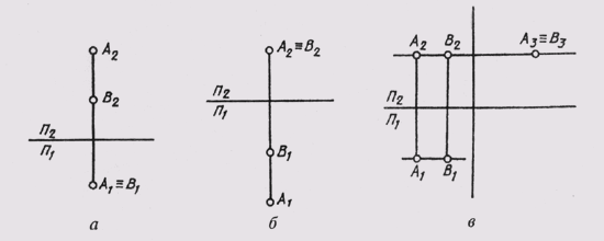 П2 (рис. 64, б), они называются фронтально конкурирующими. И если проекции точек А и В совпадают на плоскости П3 [А3 == B3] (рис. 64, в), они называются профильно конкурирующими.