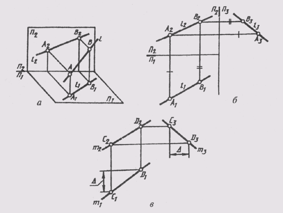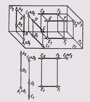 Прямые, перпендикулярные одной из плоскостей проекций, называются проецирующими. Эти прямые, будучи перпендикулярными одной плоскости проекций, оказываются параллельными двум другим плоскостям проекций. Поэтому у проецирующих прямых одна проекция превращается в точку, а две другие проекции параллельны самой