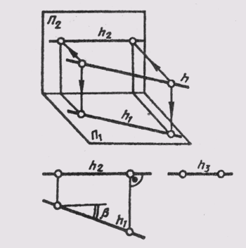Прямые, параллельные одной из плоскостей проекций, называют прямыми уровня. Название их зависит от того, какой плоскости они параллельны. Прямую, параллельную горизонтальной плоскости проекций, называют горизонталью и обозначают на чертежах h (рис. 70).