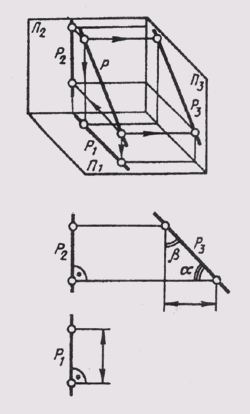Прямые h2 и f1 перпендикулярны вертикальным линиям связи; р1 и р2 располагаются на одной вертикальной линии связи и при двухпроекционном чертеже должны быть определены двумя точками прямой р.