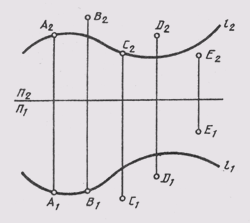 жит на одной вертикальной линии связи с точкой А1. Точки В и С не принадлежат линии l, так как в первой фронтальная, а во второй горизонтальная проекции не принадлежат соответствующим проекциям линии. Точки D и Е не принадлежат линии l, так как ни одна из их проекций не принадлежит соответствующей проекции линии.