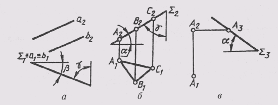 На рис. 89, б приведен комплексный чертеж плоскости Sum, составляющей угол а с горизонтальной плоскостью проекций и угол у с фронтальной плоскостью проекций. Это можно записать так: AВС ~ A2 ~ Sum2, B2 ~ Sum 2, C2 ~ Sum2.