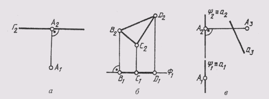 плоскость уровня. На рис. 90, а дан комплексный чертеж плоскости горизонтального уровня (Г || П1); на рис. 90, б приведен комплексный чертеж плоскости фронтального уровня (Ф || П2), Ф э АВС, А2В2С2 — истинная величина треугольника ABC; на рис. 90, в показан комплексный чертеж профильно проецирующей плоскости (U || П3, u аА; А ~ а).