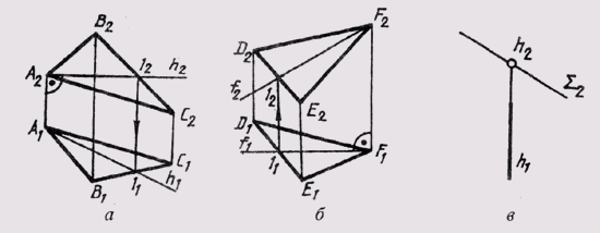 Линию, принадлежащую плоскости и параллельную горизонтальной плоскости проекций, называют горизонталью плоскости (рис. 92, а). Построение горизонтали всегда начинают с ее фронтальной проекции: h(A1 1)~ Q(ABC);h2 ~ A2;h2 _|_ A2Al;h2 ^ B2C2 = l2,l2l1 || A2A1.