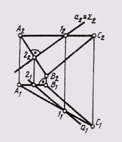 На рис. 122 приведен комплексный чертеж двух пересекающихся плоскостей £ и 0, причем плоскость Sum частного положения — фронтально проецирующая. Она пересекает линии АВ и АС плоскости 0, данной треугольниками ABC — плоскости общего положения. Точки пересечения 1 и 2 и определяют линию пересечения плоскостей. Соединив их, получаем искомую линию: a( 1, 2) = Sum^Q.