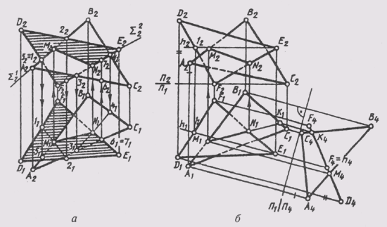 На рис. 123, б эта же линия пересечения построена с помощью дополнительных проекций данных плоскостей на плоскости П4, относительно которой плоскость DEF занимает проецирующее положение. Дополнительные проекции построены из условия, что горизонталь h € DEF проецируется в точку на плоскости П4 _|_ h. Новые линии связи проведены.через незаменяемые горизонтальные проекции точек А,