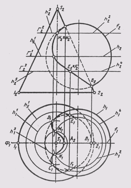 Брать вспомогательные фронтальные плоскости, параллельные П2, для построения следующих точек неудобно, так как они будут пересекать конус по гиперболам. Графические простые линии (окружности параллелей) на данных поверхностях получаются от пересечения их горизонтальными плоскостями уровня Г.