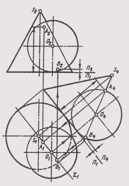 Если пересекающиеся поверхности вращения не имеют общей фронтальной плоскости симметрии (рис. 133), то самую высокую А и низкую В точки линии пересечения поверхности легко определить, построив изображения этих поверхностей на плоскости П4, параллельной осевой плоскости Sum (Sum1) данных поверхностей. Можно построить проекции всей линии пересечения в системе плоскостей П1_|_П4, а затем построить ее фронтальную проекцию в проекционной связи с горизонтальной проекцией, замеряя высоты точек на плоскости П4, так, как это показано на рис. 132 для точек А и В.
